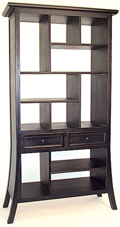 Ming Asian style curio display cabinet is made of wood in dark stain with a satin lacquer finish. Includes two storage drawers. . Substantial and fine furniture quality Asian design shelf unit . Unique key style curio shelves . Beautifully crafted solid kiln dried Birchwood and engineered Birch laminate . Classic mortise and tenon joinery . Double drawers for extra storage . Sturdy extra wide bottom to hold precious collection crafts, rare books or fine art . 39 in. W x 18 in. D x 74 in. HCheap 74 in. High Ming Curio Display Shelf Unit Specification